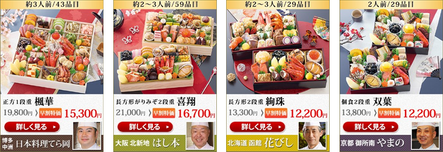 「板前や料亭監修」があると、調理法やこだわりで、家庭で作るのとは一線を画した“本物感”が出ます。せっかくなら、おうちで作れるようなお肉料理などではなく、1年に1度のおせち料理を準備することでお正月の特別感がグッと増します。